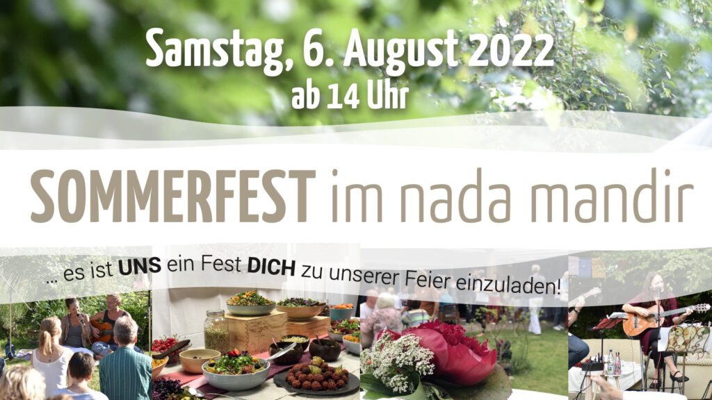 Sommerfest im Nada Mandir am 06. August 2022 ab 14:00 Uhr. Das Seminarhaus Nada Mandir wird 3 Jahre alt und wir möchten mit Euch feiern! Lust auf Live-Musik > 16:00 Uhr:…